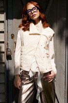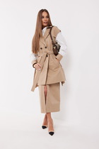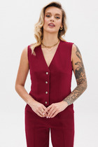 Жилет молодежный из трикотажного полотна «дабл-флис» (двухсторонний флис), прямого силуэта, с воротником «стойка», центральной бортовой застежкой на тесьму «молния». Для создания диагональных линий боковые швы переведены на полочку и оформлены в рельефные швы, в которых обработаны карманы.