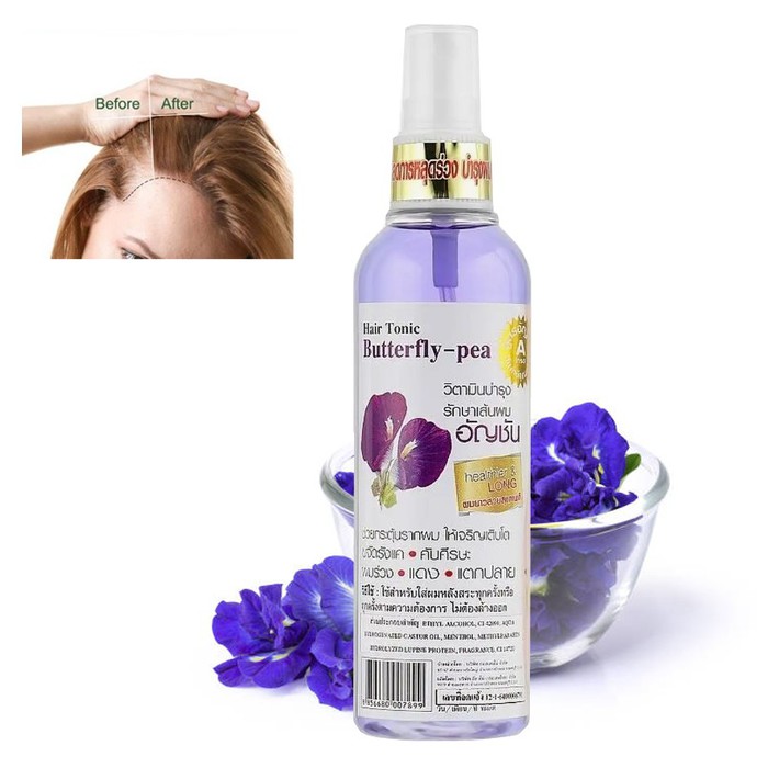 Клитория - тайское народное средство номер один для роста волос!Клитория тройчатая, называемая также мотыльковым горошком, тайской орхидеей или голубиными крыльями - это тот самый синий чай анчан, которые многие полюбили за необычный яркий цвет.В Таиланде растение культивируется в огромных масштабах, активно используется в самых разных сферах, начиная от окрашивания еды и тканей и заканчивая, конечно, уходом за волосами! Благодаря обилию микроэлементов, витаминов и антиоксидантов в составе мотыльковый горошек уже сотни лет успешно применяется ля лечения и профилактики облысения, в кажестве мощного стимулятора роста, укрепления стержня и усиления яркости оттенка! Тоник прекрасно справляется с поставленной перед ним задачей и эффективно воздействует на процесс восстановлении волос. Волосы заметно растут быстрее и гуще. Эффективное быстродействующее несмываемое натуральное средство для укрепления ослабленных волос, лечения выпадения волос и облысения.Лосьон с мотыльковым горошком наносится на кожу головы и воздействует на волосяные луковицы – укрепляет волосы и способствует росту новых волос, препятствует выпадению и появлению седых волос.Средство очень экономично расходуется, его хватает надолго. Не утяжеляет волосы.