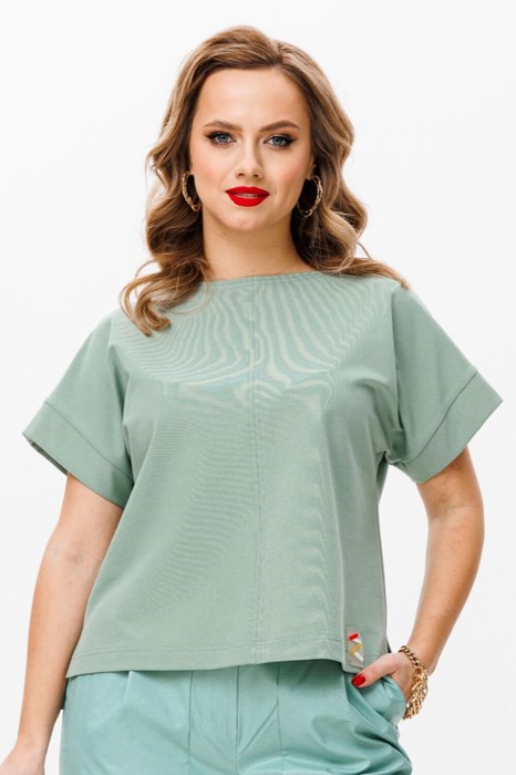 Топ прямого силуэта из трикотажного полотна со спущенным плечом, по бокам разрезы, спинка длиннее чем полочка. По центру полочки и спинки - отделачная строчка. Рукав в виде манжены, вырез горловины в форме лодочки. В качестве отделки по низу полочки - нашивка. . Топ можно легко совмещать с другими предметами вашего гардроба, создавая новые образы. (46-50) - 55 см, (52-54) - 58 см. Длина рукава (манжета): (46-54) - 4 см.