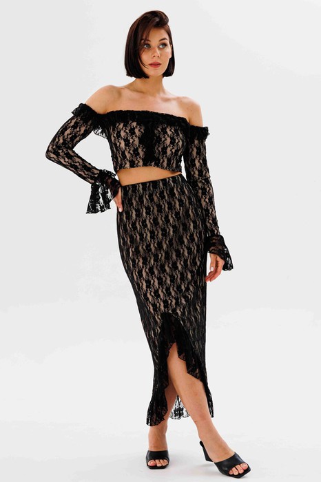 Топ выполнен из эластичного гипюра. Верх лифа и верх рукава обработан резинкой и притачен волан. По центру лифа обработан волан. Топ обработан трикотажной эластичной подклакой. По низу рукава притачен волан со скошенным срезом