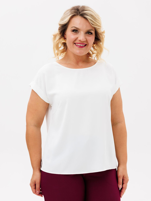 Базовая блузка из струящейся ткани. Блузка лаконичная с цельнокроеным коротким рукавом и с круглым вырезом горловины. В боковых швах разрезы. Изделие хорошо сочетается с брюками, юбками и джинсами, жакетами, а оптимальная длина блузки визуально уравновешивает фигуру. Отличный вариант под все базовые вещи в офис.