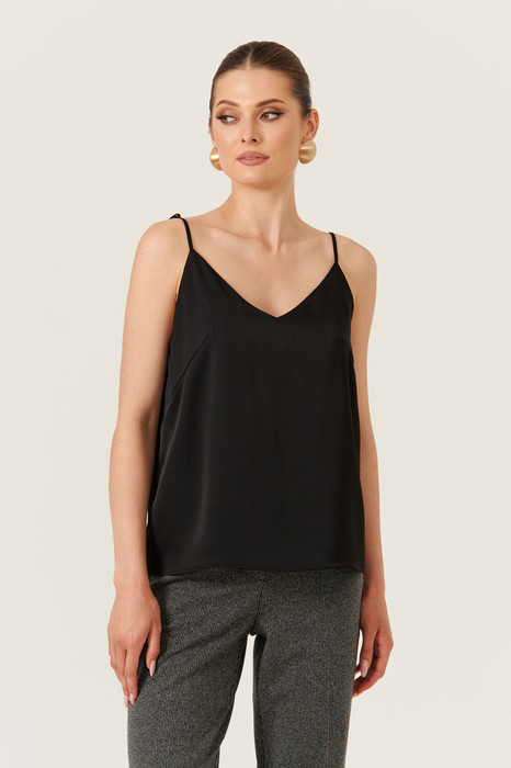 Перед украшен двумя нагрудными вытачками, которые придают изделию аккуратную посадку и подчеркнут фигуру. Горловина выполнена в V-образной форме как по переду, так и по спинке, добавляя образу изящества и женственности. Блузка оснащена регулирующими бретелями, что позволяет настроить посадку по индивидуальным предпочтениям.