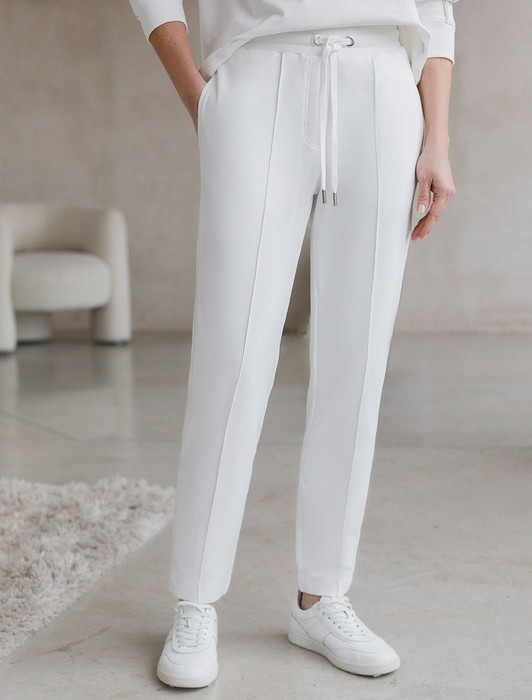 Состав: 95%Хлопок 5%ПУ Плотность: 240 Г/м2 Параметры модели на первом фото: Рост 172, бюст 88, талия 64, бедра 88 Размер товара на первом фото: 42Брюки белого цвета зауженного кроя выполнены из премиального футера-двухнитки. Лаконичный силуэт поддерживают застроченные стрелки, зрительно вытягивающие силуэт. Удобный пояс на резинке регулируется хлопковым шнурком с серебристой фурнитурой. Наличие эластана в составе изделия гарантирует комфорт и долговечность изделия. Эластичный материал хорошо пропускает воздух, позволяя телу дышать, и легко тянется, не ограничивая движения.