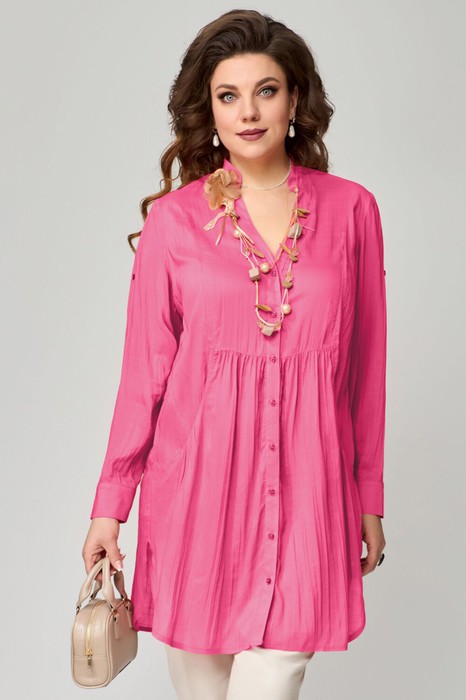ТУНИКА "Медея". Туника женская, прямого силуэта. Выполнена из хлопковой ткани. Рукав втачной, длинный, по низу притачная манжета с застежкой на пуговицы. Длина рукава регулируется патой. Фигурный вырез горловины, оформленный отрезными планками. Застежка на пуговицах. Воротник стойка. По переду выполнены фигурные карманы с небольшой сборкой по верхнему краю. По линии талии подрез с небольшой сборкой. На спине изделия прямая кокетка, посередине бактовая складка. Низ изделия фигурный, по боковым швам выполнены разрезы.