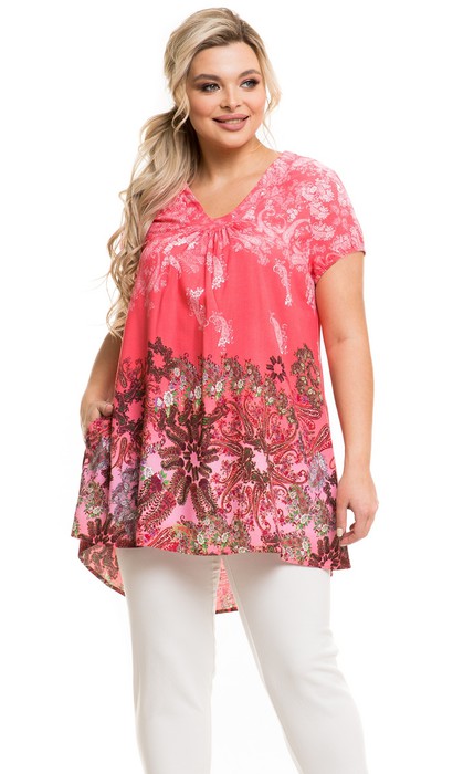 Легкая повседневная туника свободного силуэта, выполнена из штапельного полотна. Перед и спинка целые. В боковых швах расположены удобные карманы. Горловина переда и спинки с притачной планкой. По шву притачивания планки переда сборка. Рукав втачной короткий, низ рукава собран на резину. Длина рукава от плечевой точки в 48 р-ре – 12 см. в 58 р-ре – 15 см., ширина рукава по низу в 48 р-ре – 34 см. в 58 р-ре – 44 см. Низ разно-уровневый фигурный. Туника без подклада и застёжек. Длина изделия по спинке в 48 р-ре – 86 см. в 58 р-ре – 90 см.