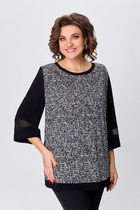 Туника женская из трикотажного полотна «кулирка» с набивным рисунком, полуприталенного силуэта, с короткими втачными рукавами. Горловина овальной формы с разрезом в центре обработана обтачкой из отделочного материала полностью повторяющей кокетку. Обтачанные углы выреза вывернуты на лицевую сторону и закреплены двумя декоративными пуговицами.