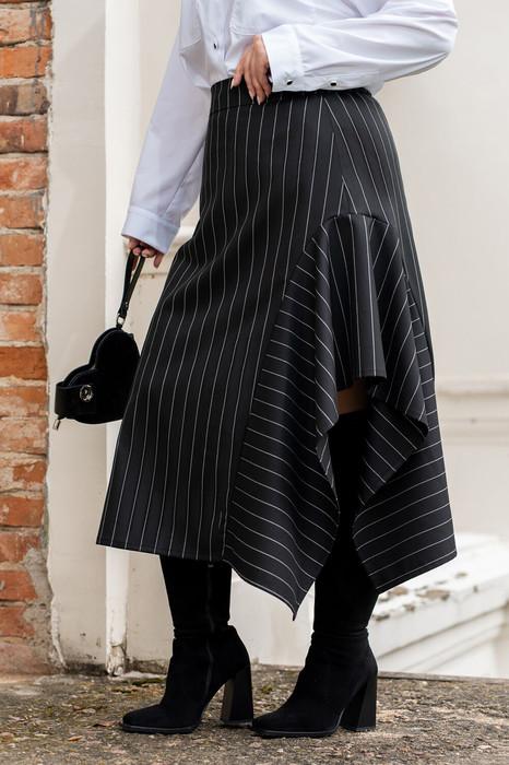 Юбка асиметричного кроя, из классической костюмной полоски, по переду пояс вставка, по спинке пояс с эластичной резинкой.