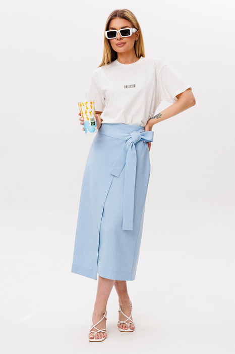 Юбка свободного силуэта с имитацией запах с завязками. В среднем шве по спинке застежка на тесьму молнию.