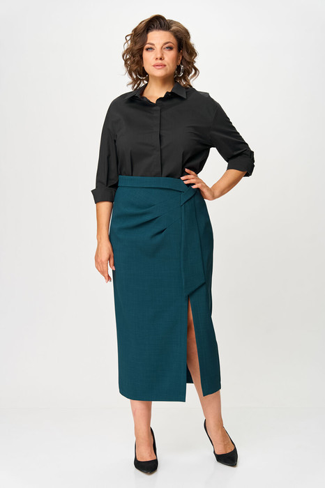 По передней половине юбки выполнены складки и левой стороны вертикальный шов, в нижней части которого обработан разрез.