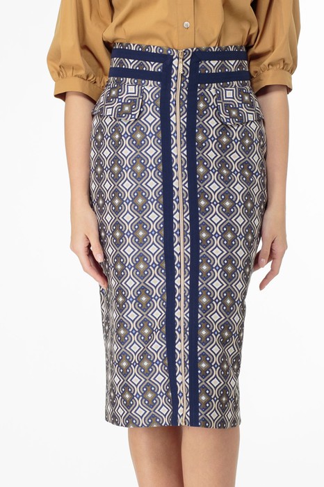 Юбка из принтованного жаккарда с отделочными деталями из экокожи.