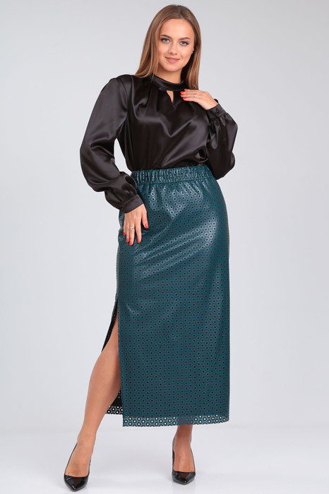 Длинная прямая юбка из экокожи с перфорацией, на подкладке, хлопковой ткани с жатым эффектом, с поясом на резинке. В боковом шве - высокий разрез.