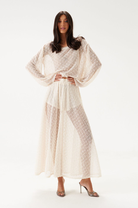 Юбка кроя полусолнце, выполнена из ажурного полотна молочного оттенка.Характеристики: крой полусолнце, подкладка мини-шортики, пояс на резинке со сборкой. Длина юбки 93 см.