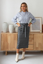 Юбка-мини свободного кроя. Выполнена из плотного трикотажа чёрного цвета. Без подкладки. Пояс не резинке со шнурком. Без застёжки. В боковых швах карманы. Длина юбки по боковому шву 38,5 см