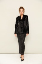 Юбка полуприлегающего силуэта выполнена из ткани плащевки на брендированной подкладе. Характеристики: полуприлегающий силуэт, пояс на резинке, по низу изделия пришито кружево. Длина по боковому шву 77 см.