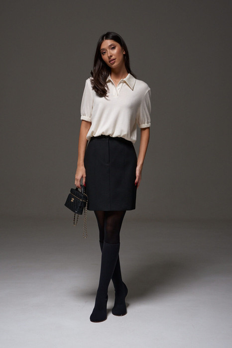 Юбка прямого кроя выполнена из текстильного полотна черного цвета. Характеристики: прямой крой, брендированная подкладка, пояс стабильный, застежка молния и пуговичка, по передней и задней части изделия вертикальные прямые рельефы. Длина юбки 47 см.