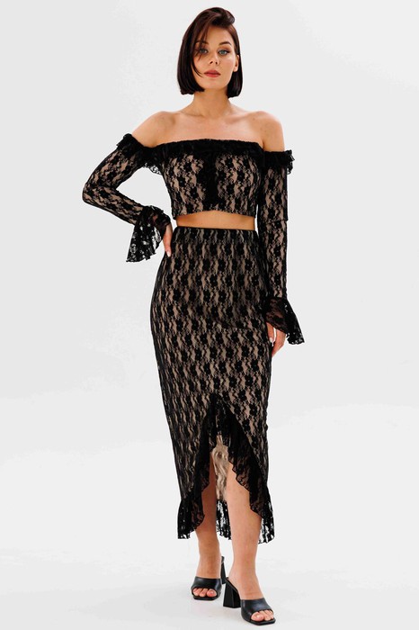 Юбка в длине миди, обработана птрикотажной эластичной подкладкой. Пояс на широкой резинке. По низу обработан волан из гипюра. Перед юбки обработан фигурным разрезом.
