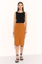 Юбка в длине  миди, выполнена из эластичной синтетичекой кожи. Застёжка - гульфик с молнией, пуговица. По центру переда обработан разрез. По задним половинам настрочены накладные карманы. По переду обработаны втачные карманы.