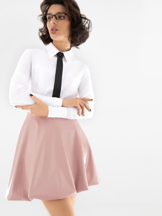Для пошива юбки-баллона нежного пудрового оттенка использовали мягкий пластичный материал, стилизованный под кожу. Полотно изготовили из переработанного полиэстера, сэкономив природные ресурсы и снизив вред, причиняемый природной среде. Must-have для эко-френдли модниц. Юбка расклешенного кроя в длине мини. Посадка на талии. Юбка застегивается на скрытую молнию сзади изделия. Есть трикотажный подклад.