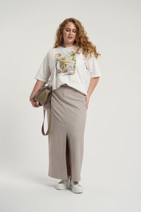 Юбка миди прямая с шлицей по переду. Застежка на молнию и петли с пуговицами. По переду фигурные карманы. Справа декоративный накладной клапан. Пояс отрезной с вставками эластичной тесьмы.
