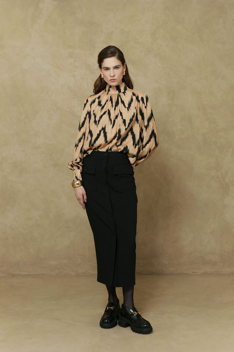 Юбка-карандаш женская, длиной ниже уровня колена, для повседневной носки, с отделочными строчками, притачным поясом и шлевками. По переду вытачки, накладные карманы с клапанами, цельнокроеная планка застегивающейся на петли и пуговицы, 2 шлевки на поясе. По спинке вытачки, центральный шов, 4 шлевки на поясе.