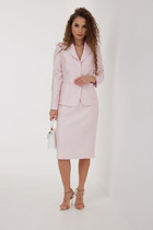 Юбка выполнена из твида. Юбка заужена к низу, на притачном поясе, длиной ниже линии колена. Застежка сзади на потайную молнию и пуговицу. Сзади в среднем шве разрез. Юбка на отлетной по низу подкладке.