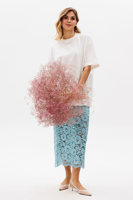 Юбка выполнена из гипюра. Юбка прямого силуэта длиной миди, на притачном поясе. На заднем полотнище в среднем шве застежка на потайную молнию. Пояс застегивается на петлю и пуговицу. По низу юбки фестоны. Юбка на короткой отлетной по низу подкладке.