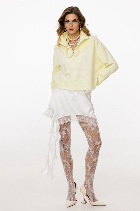 Юбка выполнена из тонкого атласа. Юбка прямого силуэта, длиной выше линии колена. Юбка на цельнокроеном поясе с эластичной тесьмой. Низ юбки фигурной формы. Юбка декорирована по низу тесьмой-кружевом и воланом с одной стороны. Юбка на подкладке.