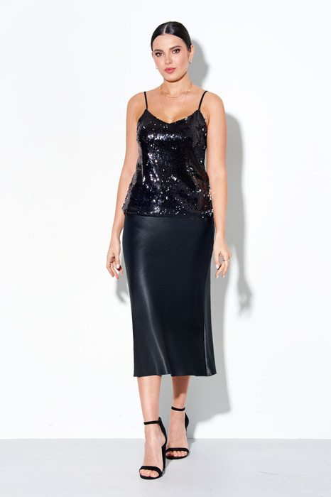 Юбка миди прилегающего силуэта из струящейся сатиновой ткани  с добавлением шелка; пояс притачной, в боковые швы которого вставлена резинка для лучшего прилегания; застежка на молнию, петлю и пуговицу.