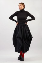 Юбка-карандаш из однотонной костюмной ткани. Модель на кокетке, дополнена шлевками под ремень. По бокам выполнены накладные карманы. В боковом шве – застежка на потайную молнию. Низ ровный, дополнен разрезом со встречными веерными складками. На подкладе.