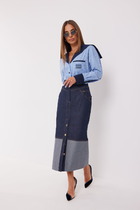 Стильная юбка А-силуэта из экокожи , длины макси. По верху юбки притачной пояс с  шлевками для ремня.  На передних половинках расположены вытачки со встречной складкой и разрезами по низу. На задних половинках расположены талиевые вытачки. На спинке по центру потайная молния. В комплект входит ремень.