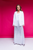 Юбка - солнце макси с узким поясом. В боковых швах расположены карманы. Застёжка на петлю и пуговицу и молнию по спинке.
