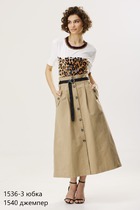 Юбка - солнце макси с узким поясом. В боковых швах расположены карманы. Застёжка на петлю и пуговицу и молнию по спинке.