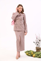 Юбка прилегающего силуэта, зауженная к низу, длиной ниже колена с высоким разрезом по центру и застежкой на тесьму- молнию. Переднее полотнище юбки с рельефами, наклонно к которым расположены карманы.