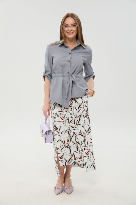 Юбка длиной миди, расклешенная к низу, с асимметричным низом. Пояс притачной, по спинке собран на резинку. Переднее полотнище состоит из трех частей. Правая часть скреплена отделочной строчкой и кнопками. В боковых швах изделия расположены карманы. По спинке изделия идёт средний шов и две вытачки для удачной посадки по фигуре. Юбка без подкладки.