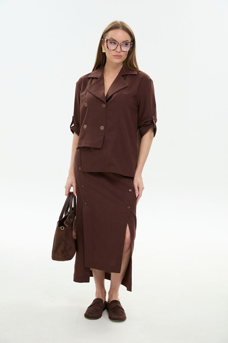 Юбка длиной миди, расклешенная к низу, с асимметричным низом. Пояс притачной, по спинке собран на резинку. Переднее полотнище состоит из трех частей. Правая часть скреплена отделочной строчкой и кнопками. В боковых швах изделия расположены карманы. По спинке изделия идёт средний шов и две вытачки для удачной посадки по фигуре. Юбка без подкладки.