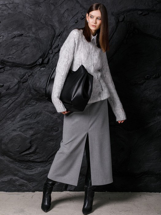 Модель прямого силуэта, на подкладе. Пояс притачной, частично собран на резину, со шлёвками. Спереди прорезные карманы с листочкой и высокий разрез в среднем шве. Застёжка на молнию и крючок на поясе. Сзади средний шов заканчивается шлицей. Ремень в комплект не входит.