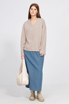 Юбка А-силуэта, длиной “миди”. Юбка выполнена из поливискозной  ткани на эластичной подкладке. Перед и спинка юбки цельнокроеные. В боковой шов вставлена потайная молния. Верх юбки обработан притачным поясом, который застёгивается на пробивную петлю и декоративную пуговицу. По центру задней части пояса вставлена эластичная тесьма.