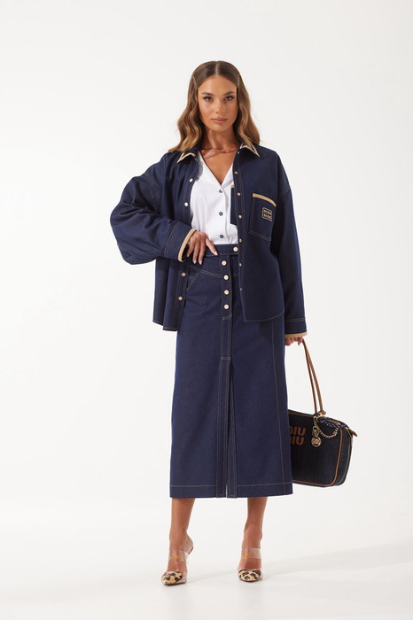 Юбка миди из джинсовой ткани. Верх на поясе со шлевками. Застежка по переду на кнопки. В боковых швах карманы. По переду кокетка и планка, переходящая в разрез. По спинке кокетка и карманы с клапаном. На клапане застежка на кнопку. Длина 85 см.