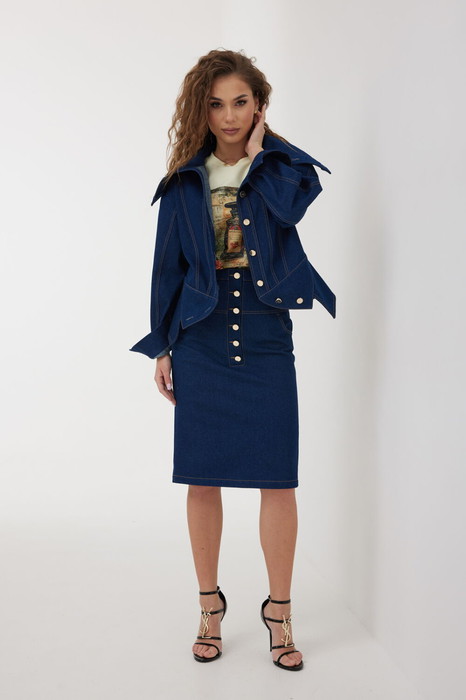 Юбка женская из джинсовой ткани, длиной чуть ниже уровня колена, зауженная книзу. Пояс притачной, застежка на декоративную молнию сзади, по переду и спинке широкие кокетки, спереди боковые карманы, а также имитация застежки на планку с джинсовыми пуговицами. По среднему шву спинки разрез. Все швы отстрочены контрастными нитками. Длина юбки без пояса - 61 см.