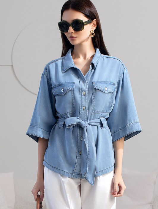 Удлиненная блузка с поясом и карманами из джинсового лиоцелла