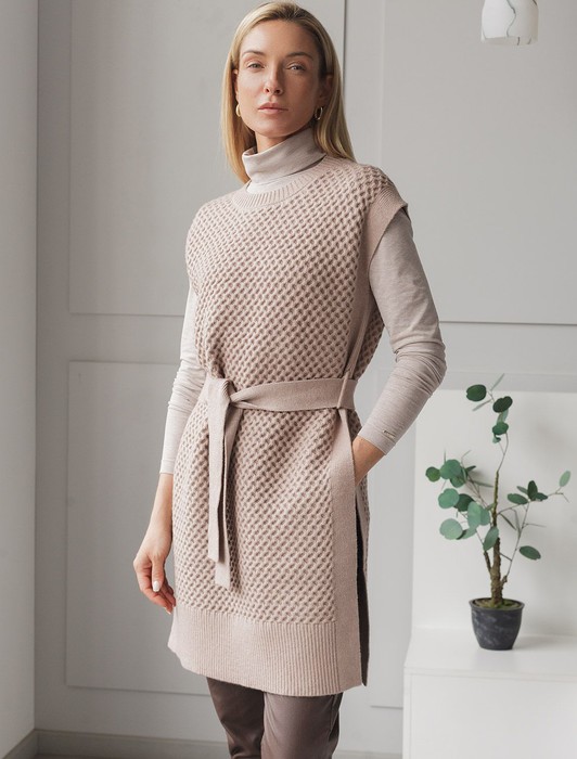 Состав: 52%ПАН (акрил) 33%ПЭ 8%ПУ 7%Кашемир Плотность: 7 GG Размер товара на первом фото: 42Удлиненный жилет выполнен из мягкой пряжи с кашемиром. Модель фактурной вязки дополнена высокими боковыми разрезами и поясом в тон изделия. Хорошо сочетается водолазками, лонгсливами и блузками. Мягкая пряжа очень приятная к телу, поддержит комфорт на протяжении всего дня, при этом не перегревая. Сочетается в костюме с брюками D38.013, D38.012 и юбкой D36.016