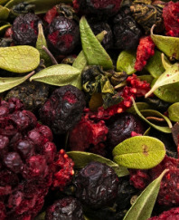 Тегуань инь, черника, сублимированная ежевика, лист брусники, кусочки сублимированной клубники. Содержит пищевые ароматические масла