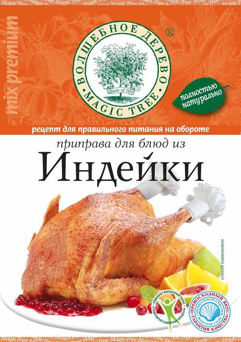 Приправа содержит набор пряностей и сушеных трав в оригинальном сочетании для приготовления блюд из индейки. CОСТАВ: Соль морская, паприка, чеснок, кориандр, хмели-сунели, имбирь, сахар, перец черный