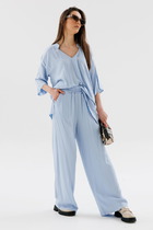 Удобные вязаные брюки прямого силуэта с поясом на резинке и стрелками. Связаны из мягкой полушерстяной пряжи. В составе 50% шерсти и 50% акрила. Шерсть в составе сохраняет тепло, а благодаря волокнам акрила изделие мягкое и дольше сохраняет форму.
