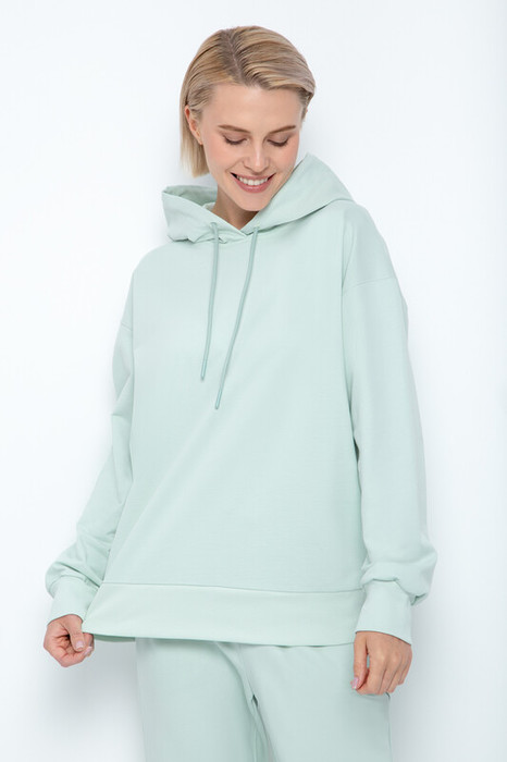 Мягкий однотонный джемпер с капюшоном и длинными рукавами из мягкого петельчатого футера. В составе 100% натурального хлопка. Манжеты и пояс выполнены из эластичного трикотажа в рубчик. В капюшоне подклад. Свободная посадка придаёт джемперу объём. Идеальный и комфортный вариант на каждый день.