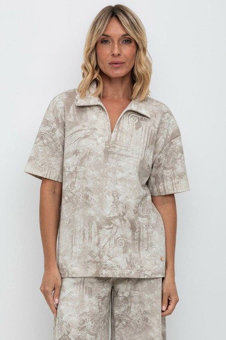 Джемпер поло с короткими рукавами из плотного набивного трикотажа интерлок с V-образным вырезом. Спущенное плечо придает изделию свободный силуэт.