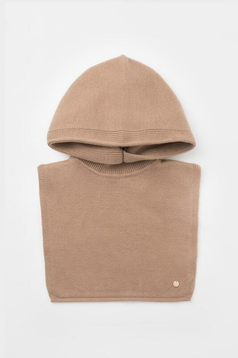Теплый вязаный капор с глубоким капюшоном из шерсти и акрила. Шерсть в составе хорошо удерживает тепло, а волокна акрила делают изделие мягким и предотвращают деформацию и появление катышек. Лаконичный крой хорошо сочетается с верхней одеждой.