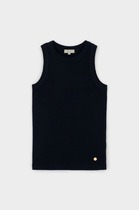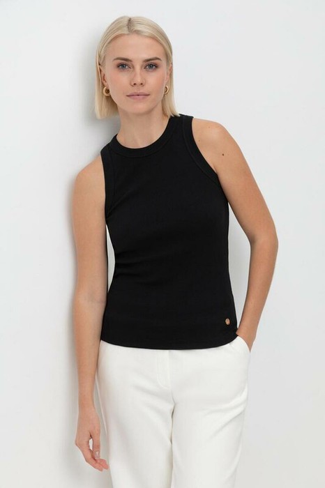 Классическим элементом гардероба является базовый топ в рубчик. Бретели стандартной ширины, круглый вырез и добавление эластана делают изделие комфортным в носке и универсальным в повседневной жизни. Темный оттенок позволяет выбирать его в качестве базы под любой образ.