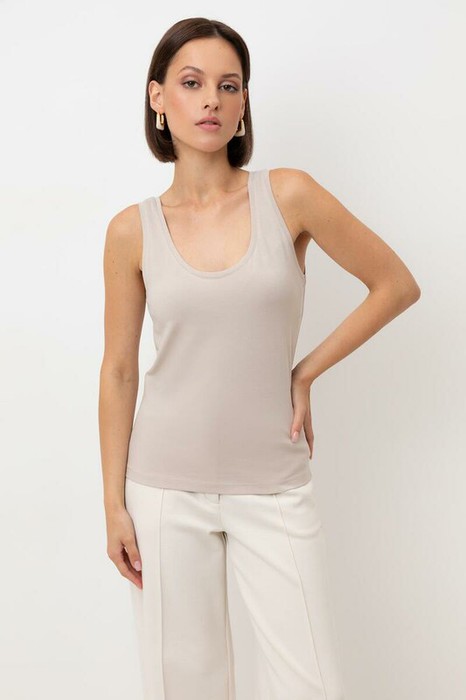 Классическим элементом гардероба является базовый топ из хлопка. Узкие бретели и глубокий вырез делают изделие комфортным в носке и универсальным в повседневной жизни.