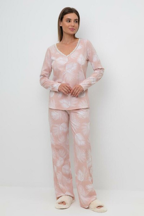 Легкий комплект для комфортного сна и отдыха набивного трикотажа с нежным рисунком из 100% натурального хлопка. Джемпер с V-образным вырезом, украшенный эластичным кружевом комфортно садится по фигуре. Брюки с поясом на резинке и атласной лентой. Гладкий материал приятен к телу и позволяет коже дышать.